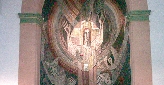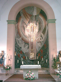 ![]() Dominikanerinnenkloster Bühl-NeusatzeckDas Werk: Chorwand-Mosaik, 1979/80Das etwa 38 m2 große Chorwand-Mosaik wurde in erdenen Farbtönen komponiert.: Es zeigt Jesus als Pantokrator mit den Symbolen der vier Evangelisten – beschrieben in der geheimen Offenbarung des Johannes.Zitat eines Gebetes von Max Huber: „Herr Jesus Christus, Sohn des lebendigen Gottes, Licht der Welt, das von oben kam aus der Herrlichkeit Gottes, des Vaters. Du bist eingestiegen in unsere Geschichte, um uns den Weg zum Aufstieg zu ebnen. Du hast den Tod nicht gescheut, aus Liebe zu uns, und ihn durchkreuzt durch deine Auferstehung …“ „Das Licht kam in die Finsternis, aber die Finsternis hat es nicht ergriffen“, Johannes Die Symbole der 4 Evangelisten: Der Stier für Markus, der Adler für Johannes, der Löwe für Lukas und der Mensch für Matthäus |